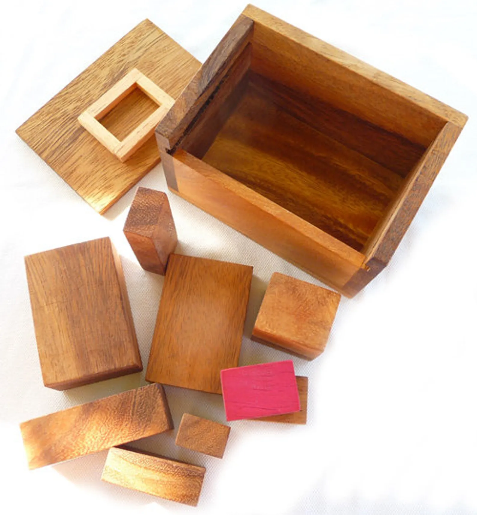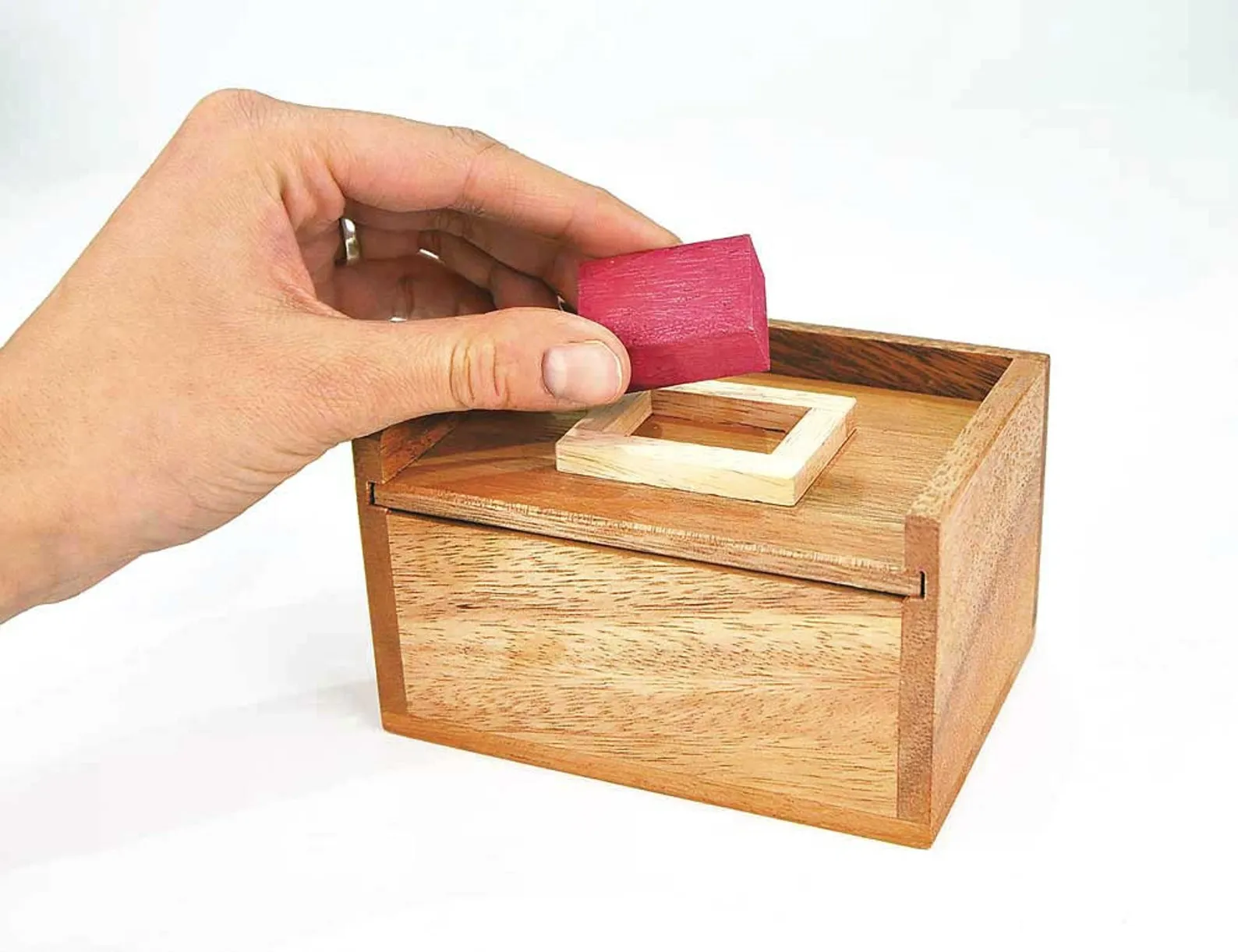 The puzzle aspect requires the user to discover how to open the box and reveal the hidden feature inside. This usually involves sliding or shifting parts in a specific order rather than applying force. Hidden Red Stone Wooden Trick Puzzle Gift Box therefore offers a calm, focused challenge for adults and older children. Once opened, the interior can hold a small token or note, making it suitable for presenting a modest surprise.