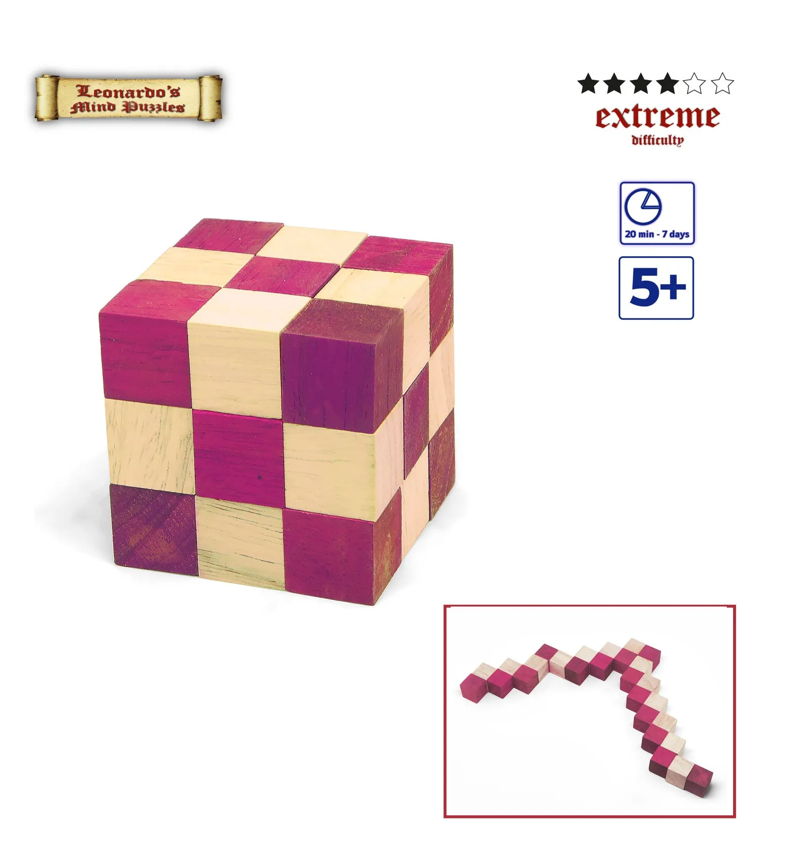 The puzzle consists of linked segments that can be rotated to create different shapes. The main goal is to return the chain to its original cube form, which calls for spatial thinking and a calm, steady hand. This makes the Red Snake Wooden Cube Challenge Puzzle For Home Office suitable for adults and older children who enjoy quiet brain teasers. It offers a simple way to reset focus during study or work sessions.